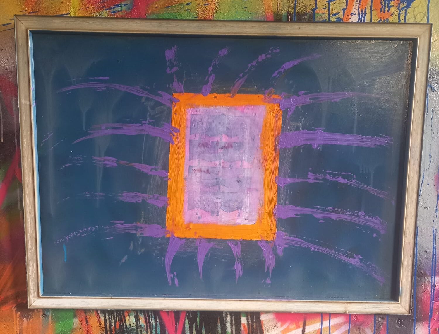 Den Mittelpunkt des dunkel grundierten Werks bildet eine GelliPlate-Arbeit auf Papier, welche mit Kleister aufgebracht wurde. Dieses wurde mit dem orangenen Acrylauftrag als Rahmen hervorgehoben, abgerundet durch die lila Acrylfarbe, die sich in Strichen verschiedener Form und Dicke in Richtung Rahmen zieht.