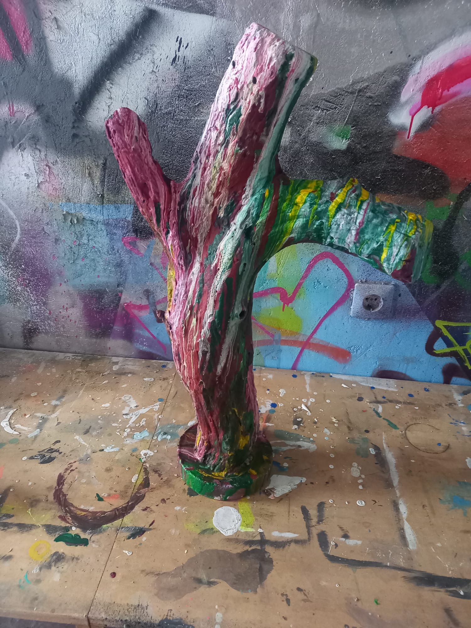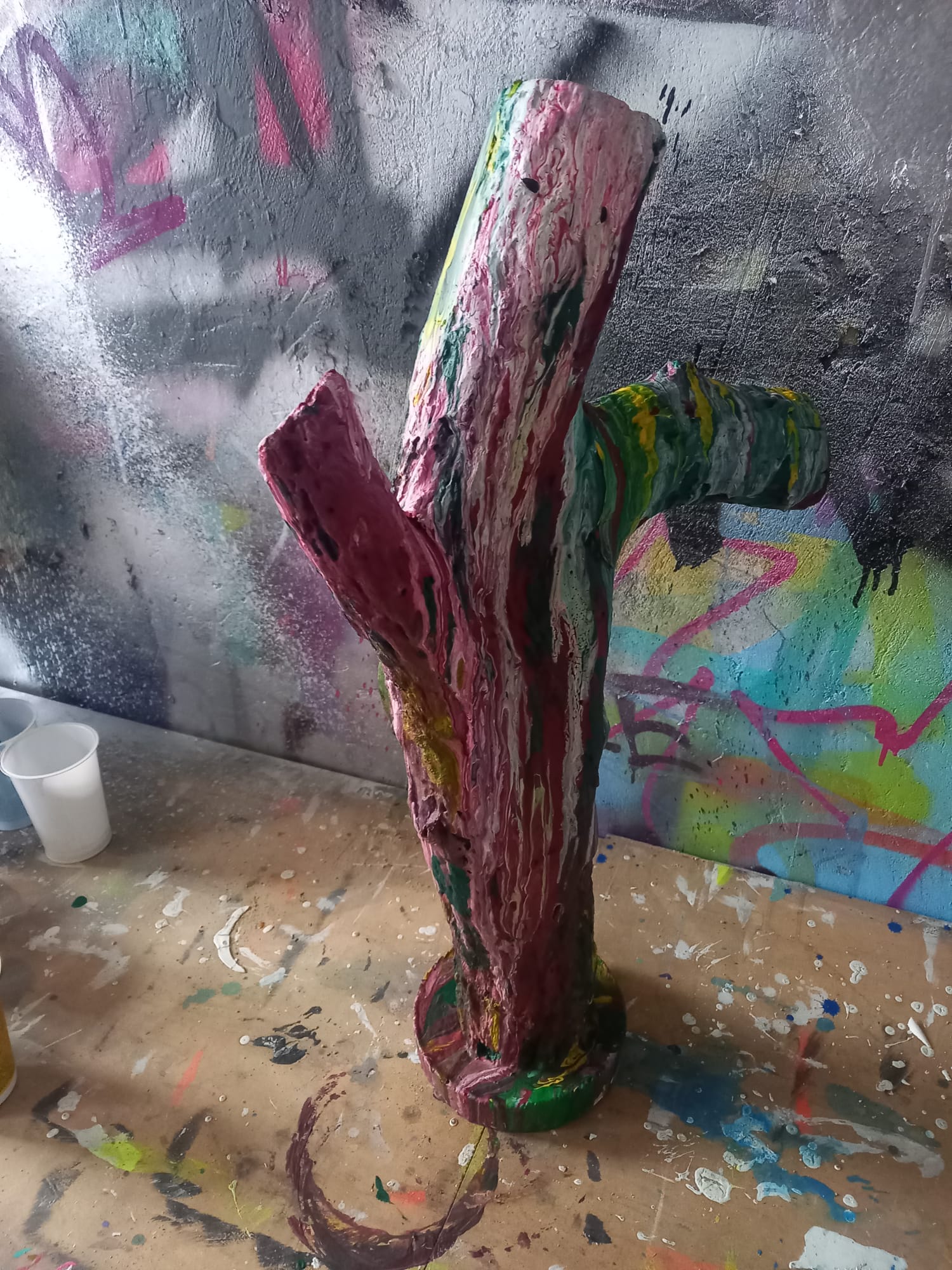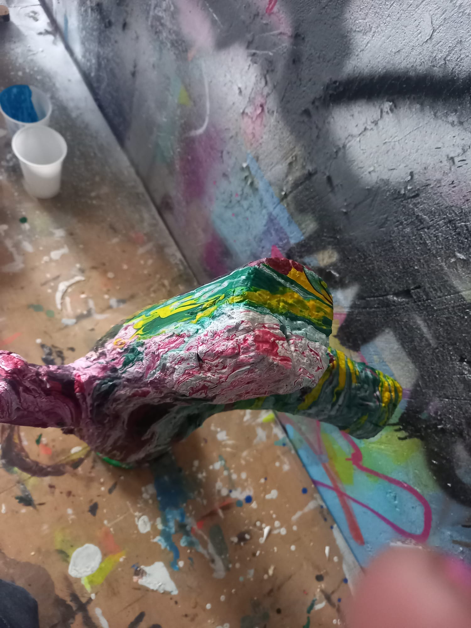 Acrylic Pouring auf Holz, in Betonfuß eingegossen