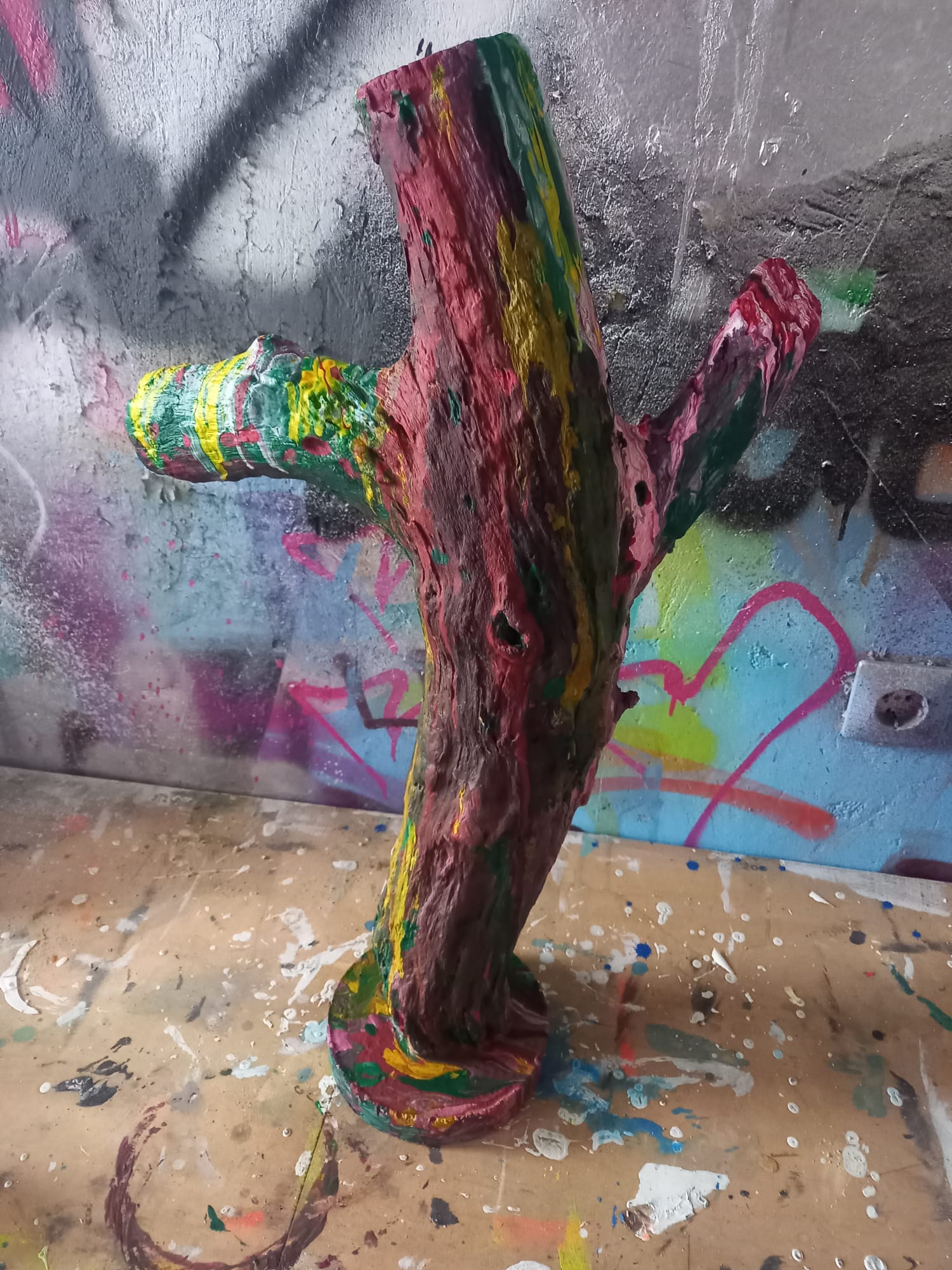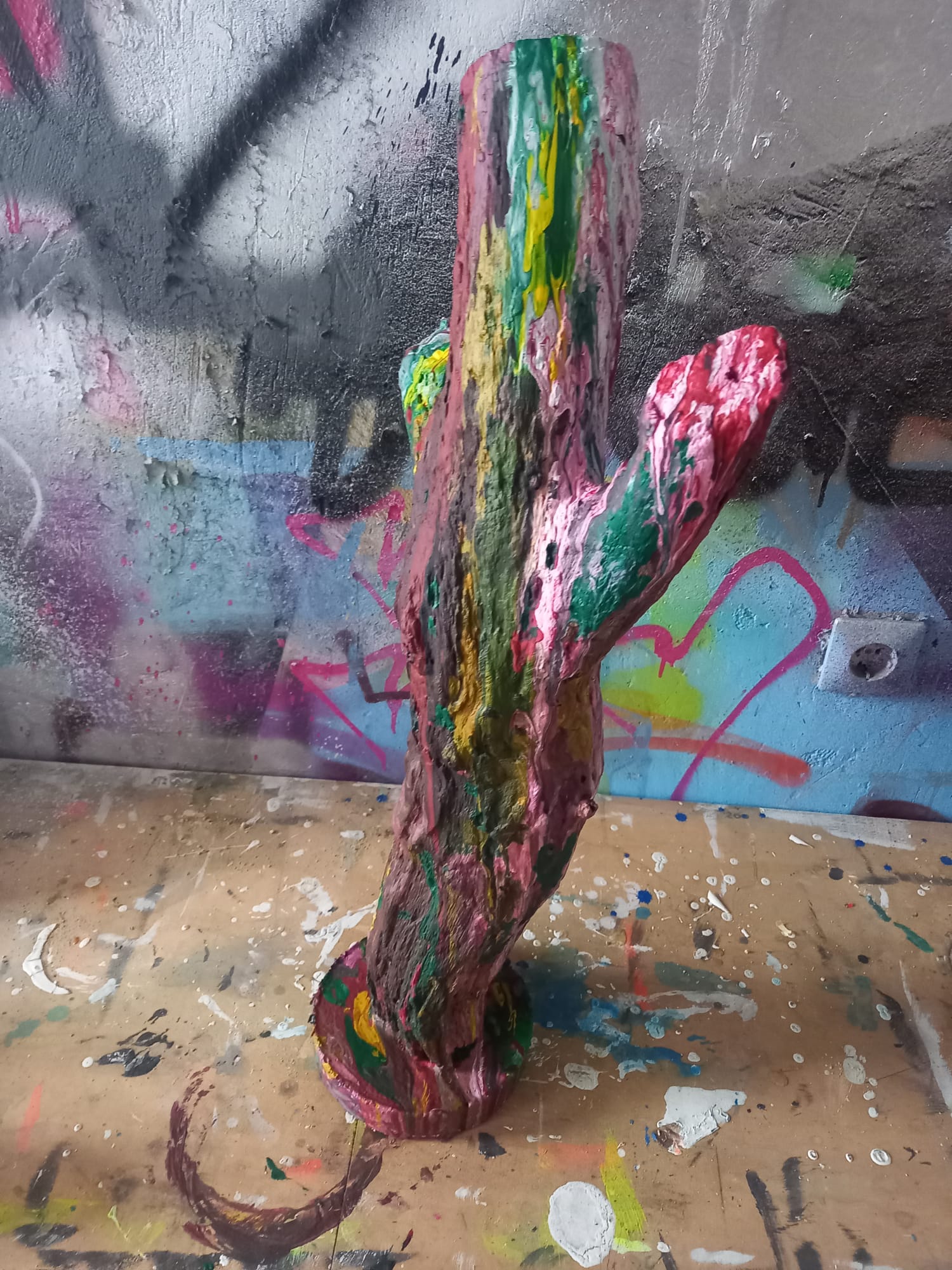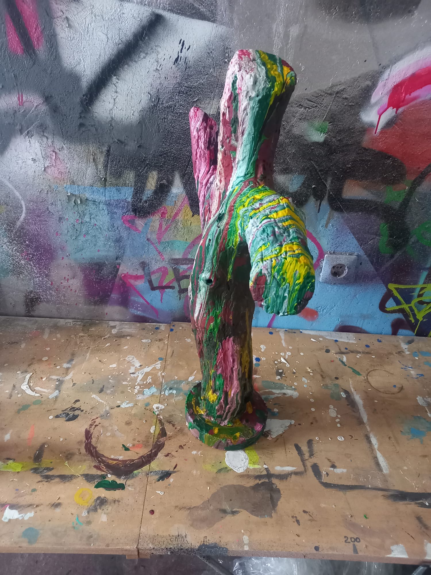 Acrylic Pouring auf Holz, in Betonfuß eingegossen